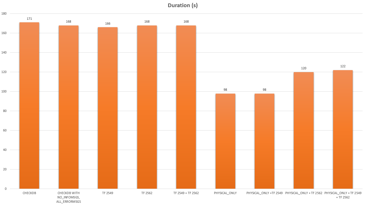 --CHECKDB WITH NO_INFOMSGS, PHYSICAL_ONLY, ALL_ERRORMSGS +TF2549 +TF2562