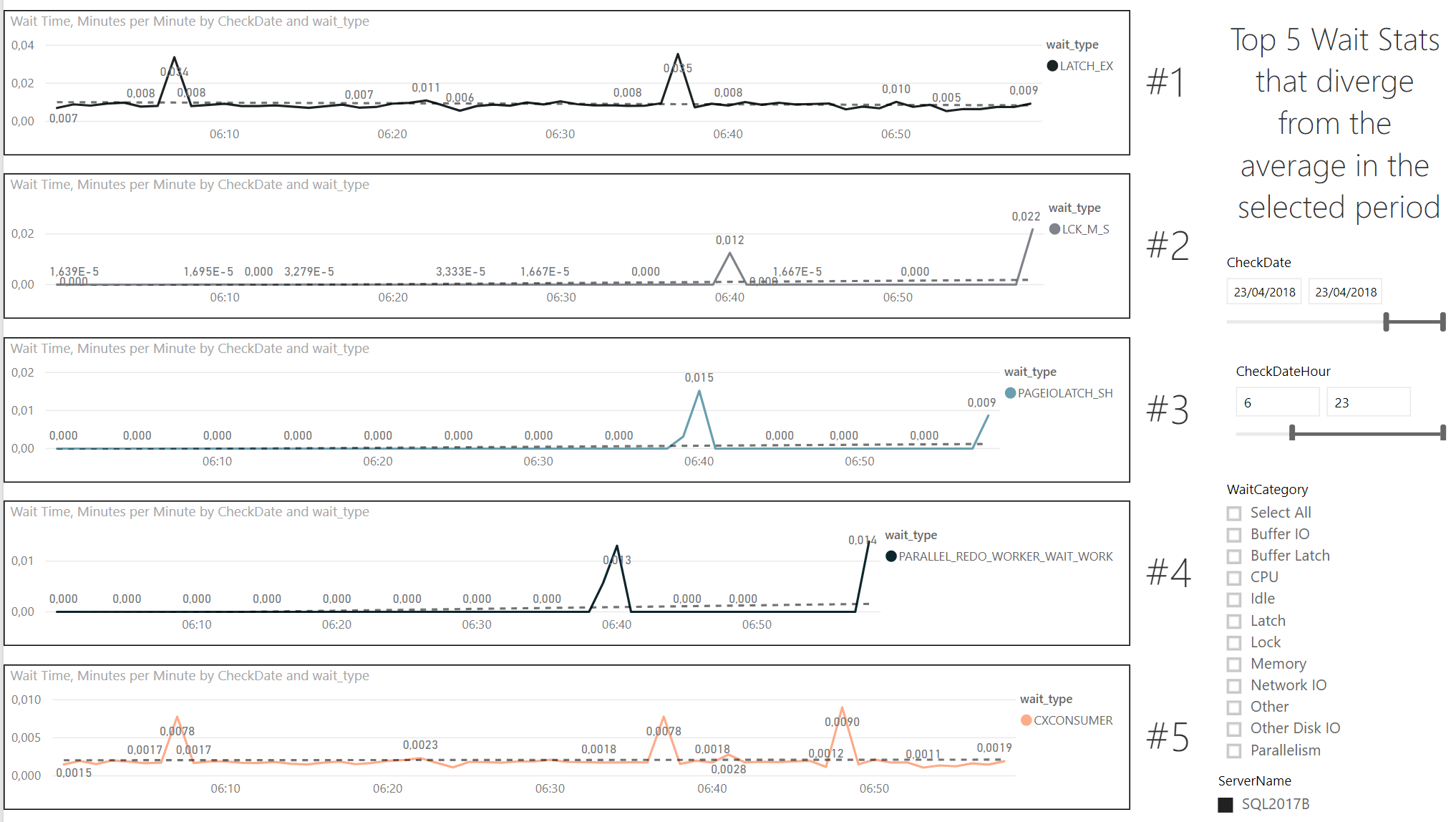 Then, I’ve created 5 support measures, that help me filter in each graph only the wait type that counts:
