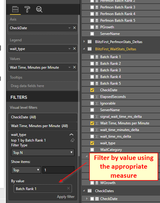 This measure allows me to actually select only the wait type element in my dimension that corresponds to the specific ranked value calculated in the measure above. The other 4 are identical, it only changes the rank number selected. How to filter only the specific wait type in the specific visual? Using the advanced visual filter like so: