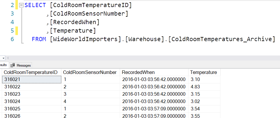 Let’s set the case scene; I’m starting from the ColdRoomTemperatures_Archive table in the WideWorldImporters sample database, why? I already had the DB restored and ready to go, it has a reasonable number of rows and the column ColdRoomSensorNumber it’s a prefect candidate for the example I had in mind.