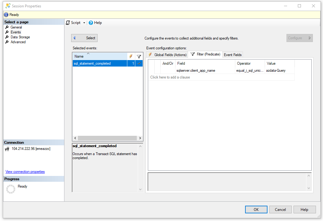 The extended event is set up to capture all the “SQL Statement Completed” events coming from Azure Data Studio e putting them into a histogram for counting them.