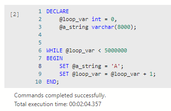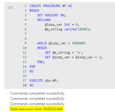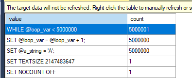 What happens in a loop? For each statement that’s completed, a token is sent, which means that for this loop that contains 3 statements (the WHILE loop itself it’s a statement) 15 Million tokens are sent to the client.