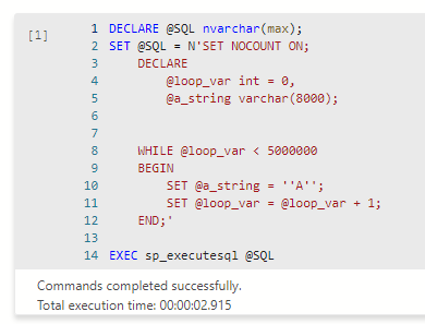 It’s not ideal to have loops in SQL Server batches, however, if you have to, at least avoid overloading your client with “SQL Statement Completed”/“DONE” messages by using one of the techniques described above,