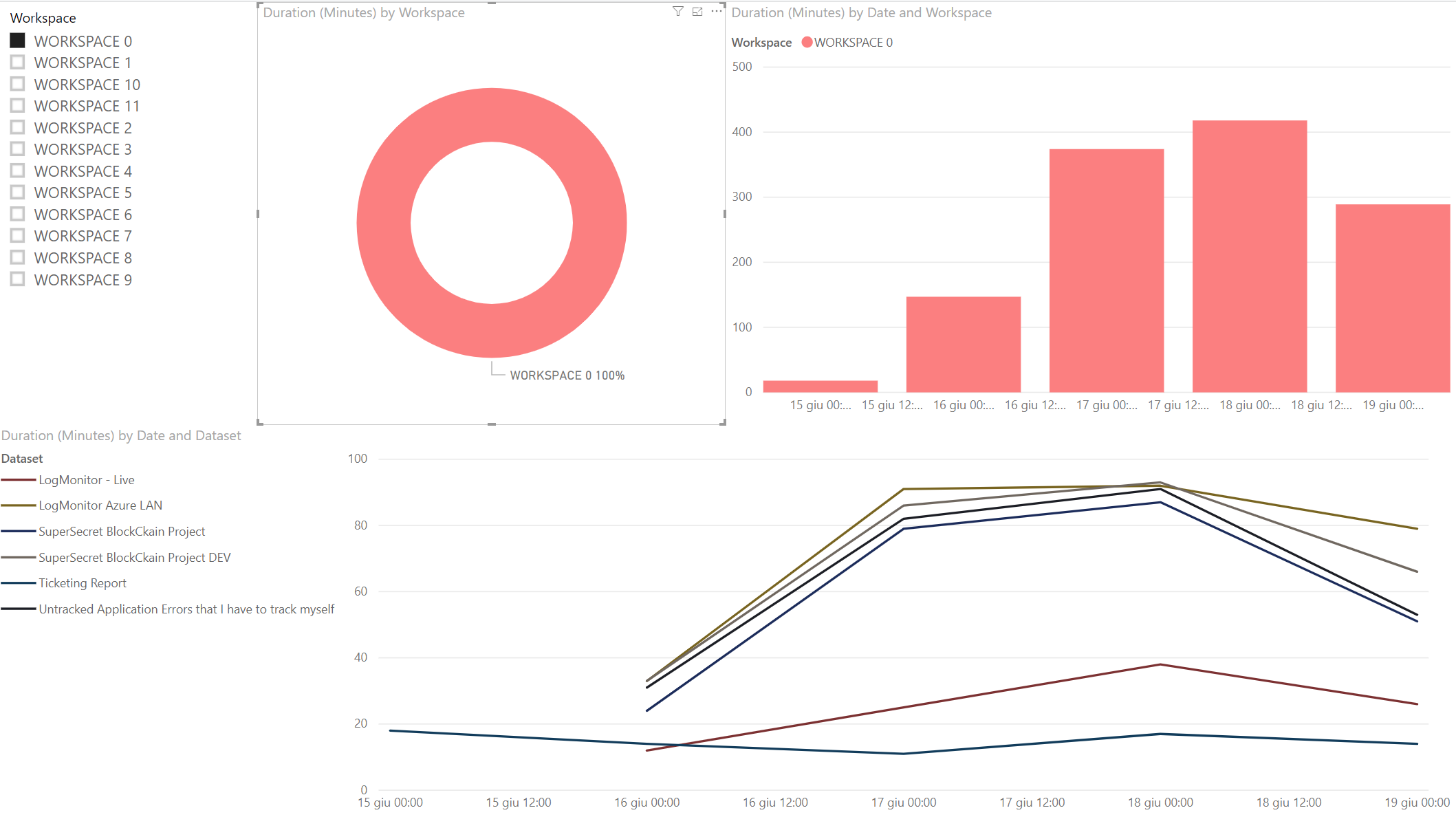 The third page is releated to the performance of the single workspace/dataset, using the timestamps in the refresh data we’re able to tell if there is any relevant deviation from the norm and what’s the total time that we’re passing each day refreshing datasets.
