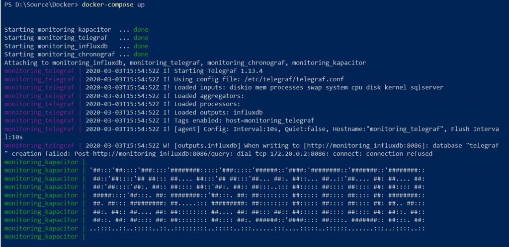PS: Don’t mind the error in the screenshot above, the creation of the container was so fast that influxDB wasn’t fully spun up and ready to accept queries when telegraf started making requests, it will fix itself in the next few milliseconds.