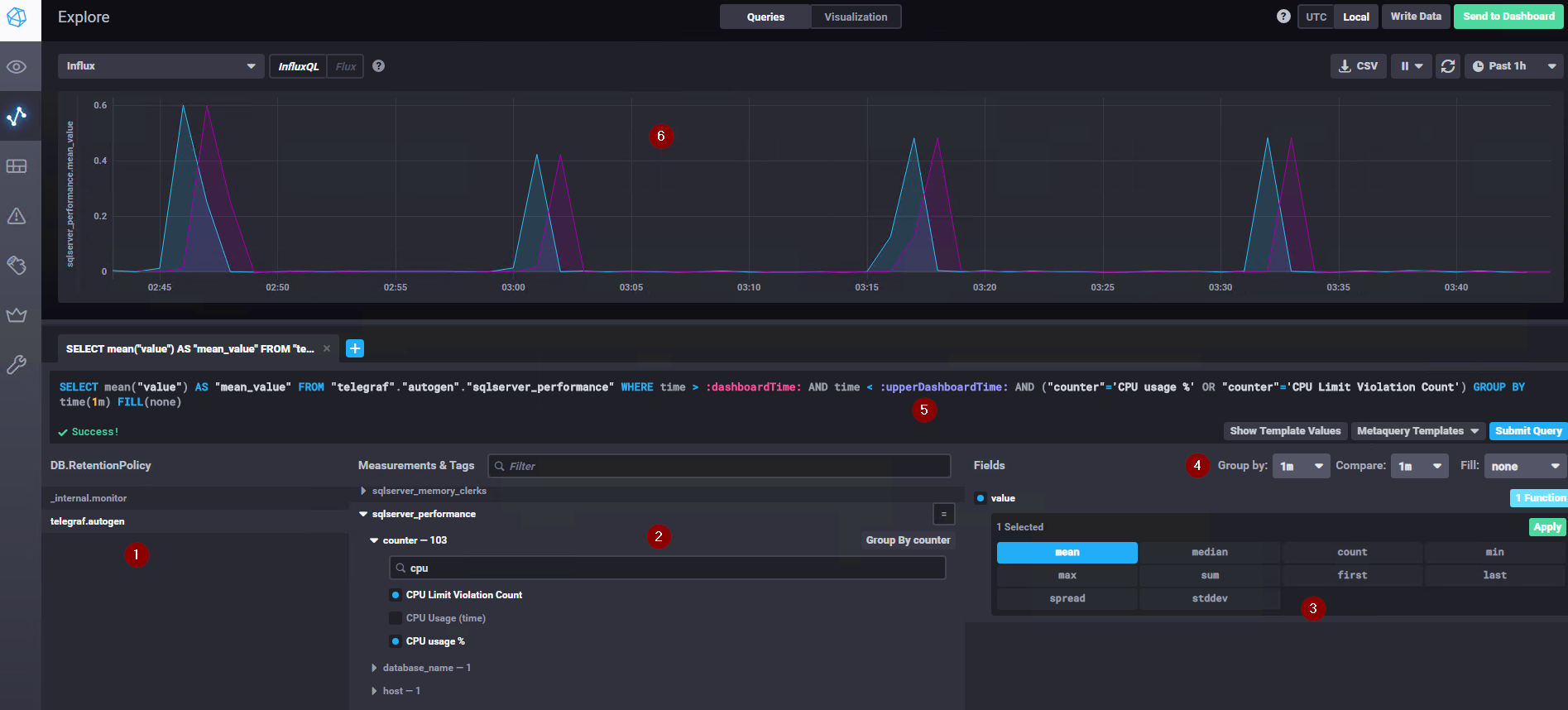 It’s very intuitive to just go into the type of data that you are searching for; in the example I’ve searched for CPU counters in the sqlserver_performance table created by telegraf - This defines the values to get and the aggregation(s), more than one aggregation is selectable