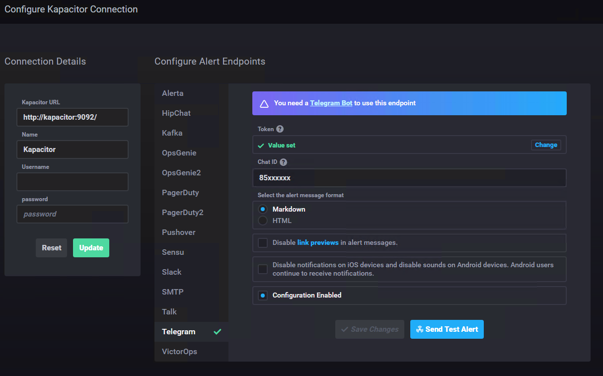 In the configuration menu of Chronograf, Kapacitor can be configured via a GUI, a lot of endpoints can be added for Kapacitor to send the alerts to