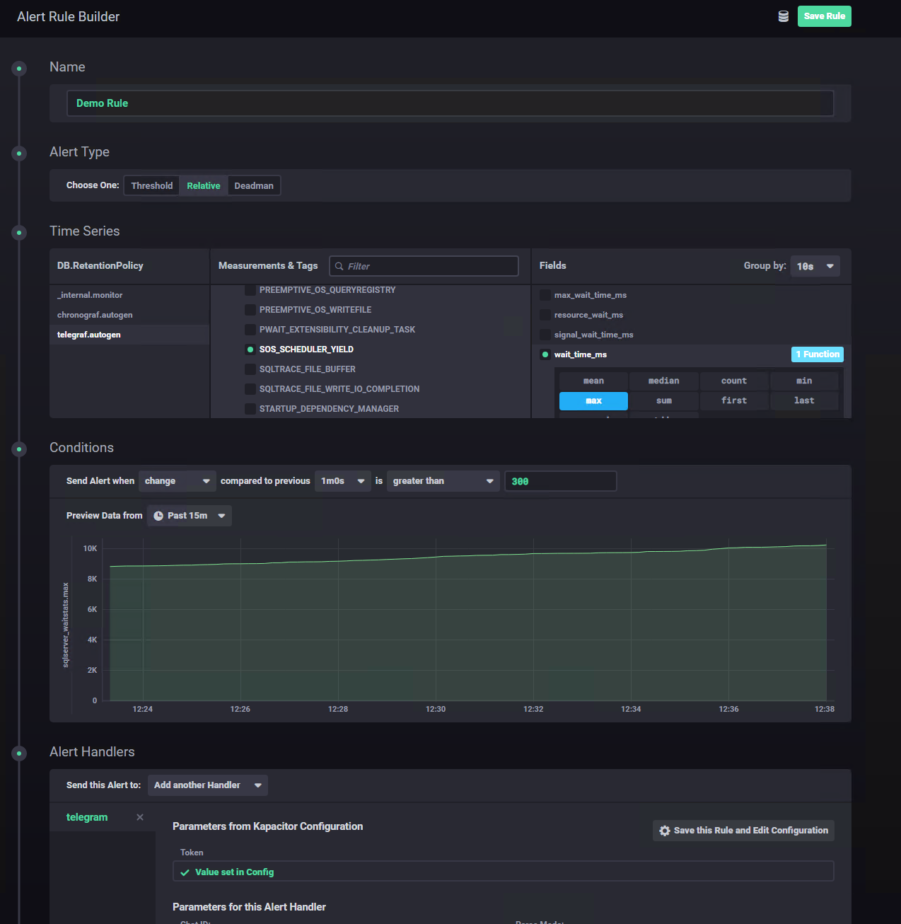 Basically, I’m switching Grafana for Chronograf and adding Kapacitor for alerting. The switch to Chronograf makes it easier to write InfluxQL queries because it offers an easy to use query composer, which didn’t work as well in Grafana, however, we’re losing the possibility to query directly the SQL Instance(s) in order to get additional business metrics other than the technical ones gathered by influxDB via Telegraf.